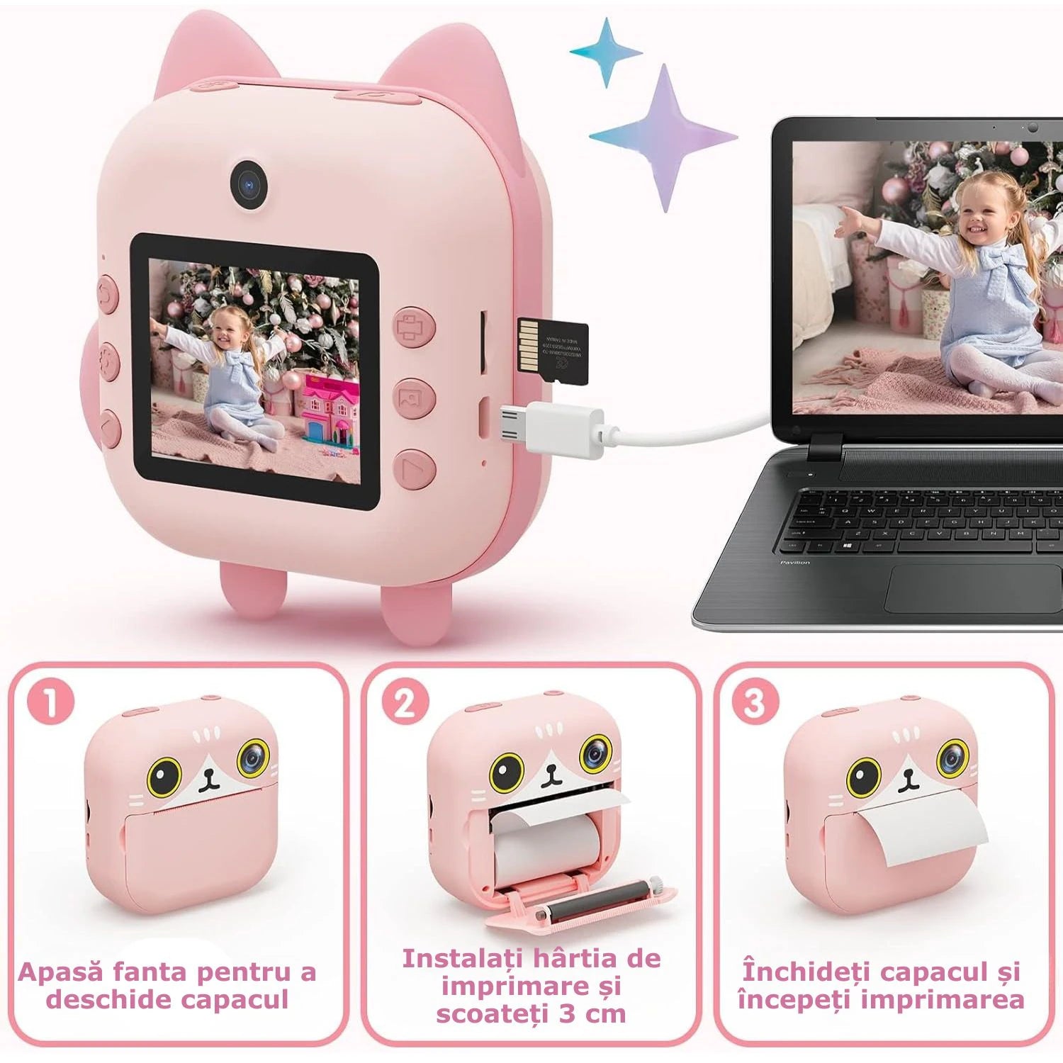 Camera foto instant pentru Copii Simply Joy, Foto, Video, Printare, HD 1080p, ecran 2.1 inch, Baterie Reincarcabila, Card Memorie 32GB, Cablu USB, Printare fara Cerneala, 3 Role incluse