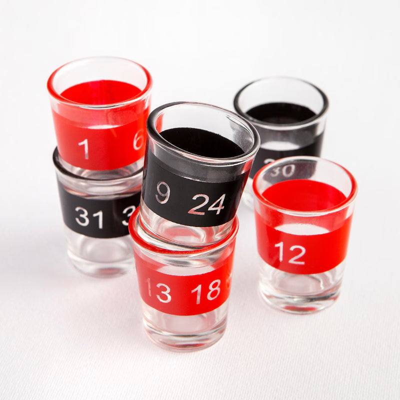6 pahare de shot din sticlă (negre și roșii), numerotate