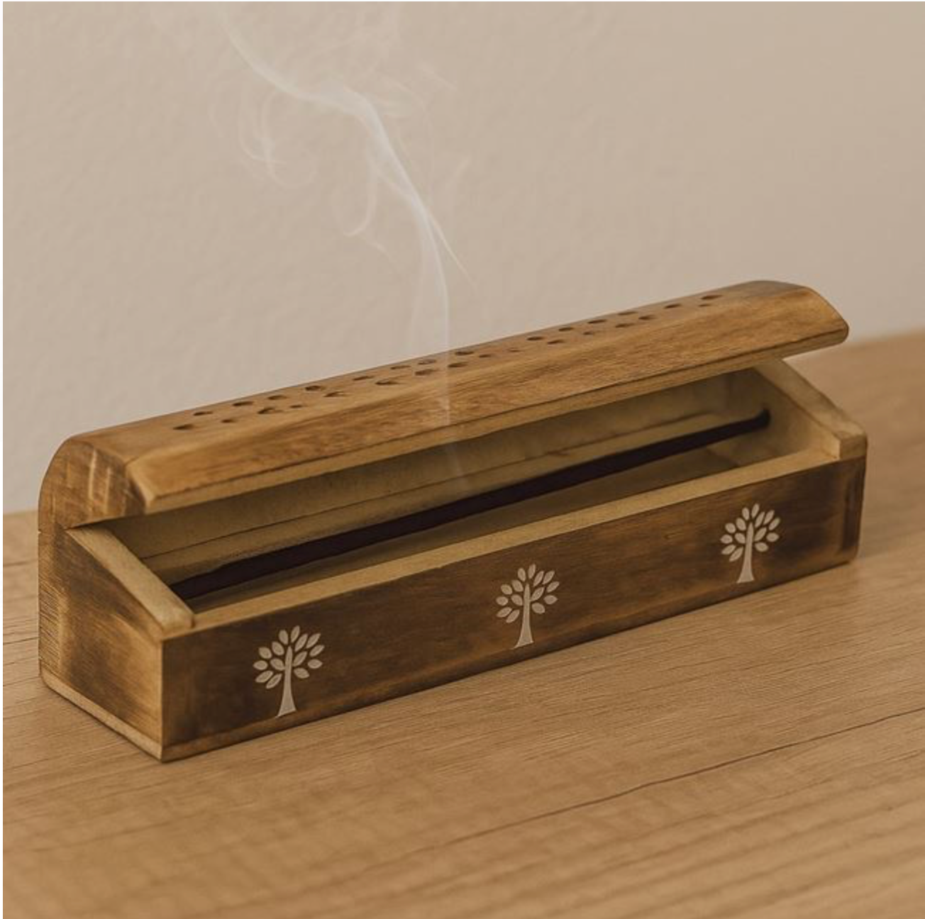 Set de bețișoare parfumate cu aromă „Forest Rain”, ideale pentru a aduce prospețimea naturii în locuința ta. Bețișoarele mov sunt așezate într-un suport elegant din lemn perforat, decorat cu modelul Copacul Vieții, care adaugă un accent decorativ deosebit. Cu dimensiunile de 31 x 6 x 6,5 cm, setul este perfect pentru a parfuma discret și armonios orice încăpere, creând o atmosferă relaxantă și echilibrată.