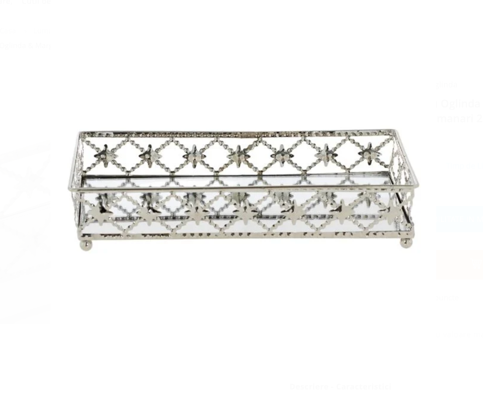 Tava decorativă cu bază oglindă și margine metalică sculptată este un accesoriu elegant care pune în valoare orice aranjament decorativ. Reflexia discretă a oglinzii amplifică lumina și evidențiază obiectele așezate în interior, creând un efect vizual rafinat și plin de stil.