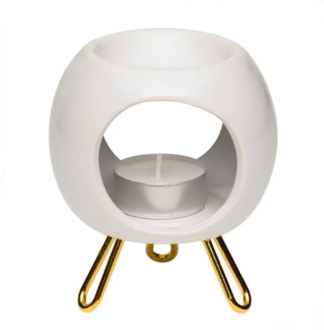 Suportul pentru ulei parfumat din ceramică albă, prevăzut cu piciorușe aurii elegante, este un accesoriu decorativ ideal pentru crearea unei atmosfere relaxante în locuință. În partea superioară se poate adăuga ulei parfumat sau un cub wax melt, iar la bază se introduce o lumânare pastilă care, prin căldură, difuzează treptat aroma în încăpere.