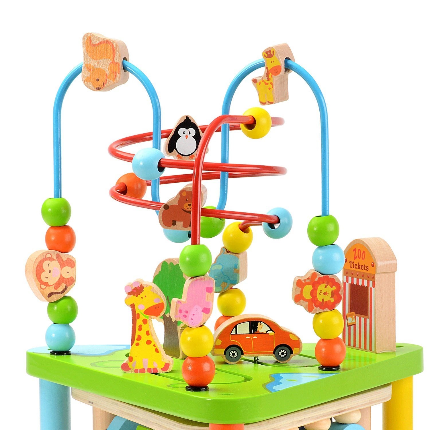 • Pe partea superioară se află un traseu cu sârme și bile colorate, un labirint cu forme și elemente tematice Zoo (animale, bărci etc.)